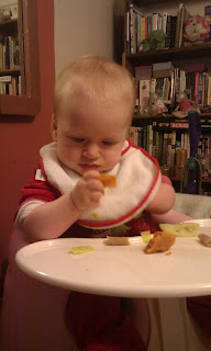 One of the main guidelines for this exercise (according to the book my wife read) is to make the whole exercise seem quite normal, and a big part of this is NOT laughing at the youngling while she's tearing her food to shreds and running her own personal experiments into the viscosity and spreadability of various foodstuffs. Not tittering while Issy smears food anywhere she can is hard enough, but it's almost impossible to keep from belly-laughing when Issy's face betrays her opinion of the taste any of any morsels that actually manage to make it to her mouth.